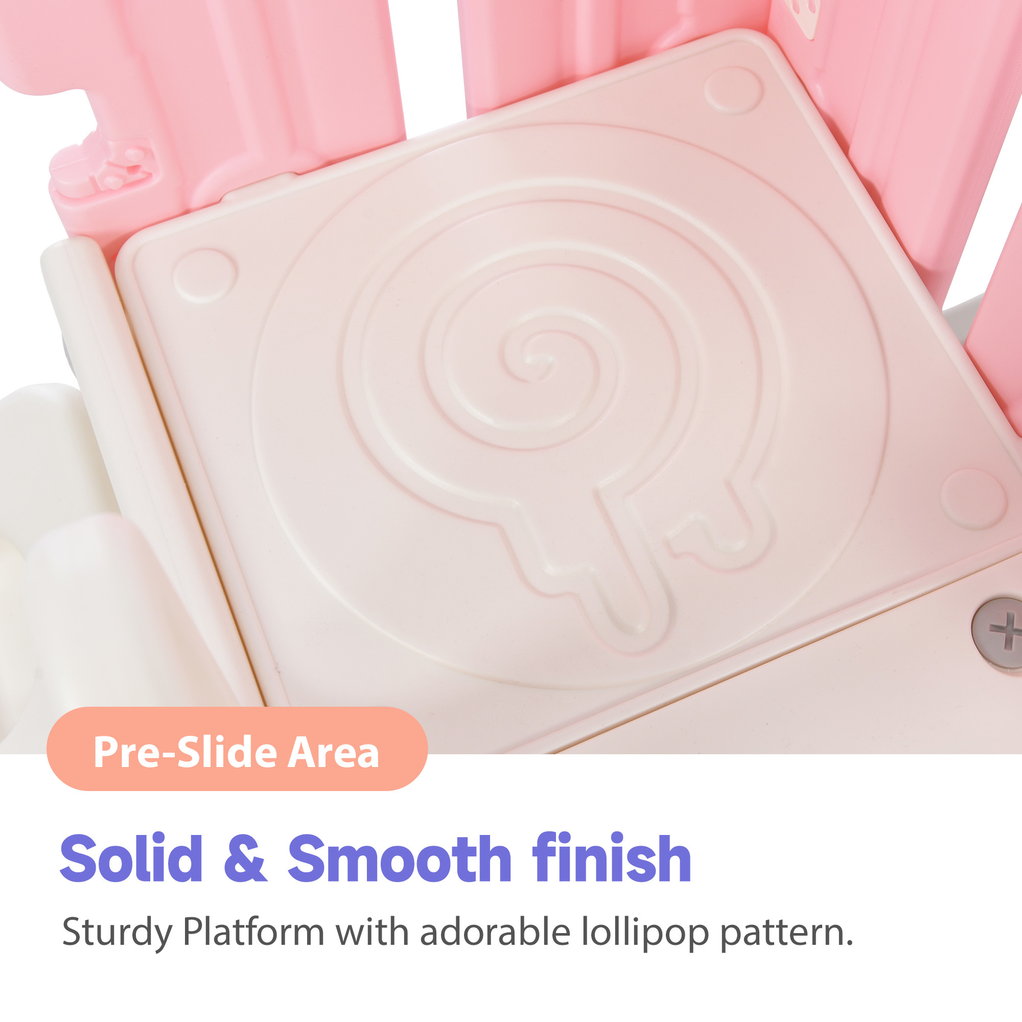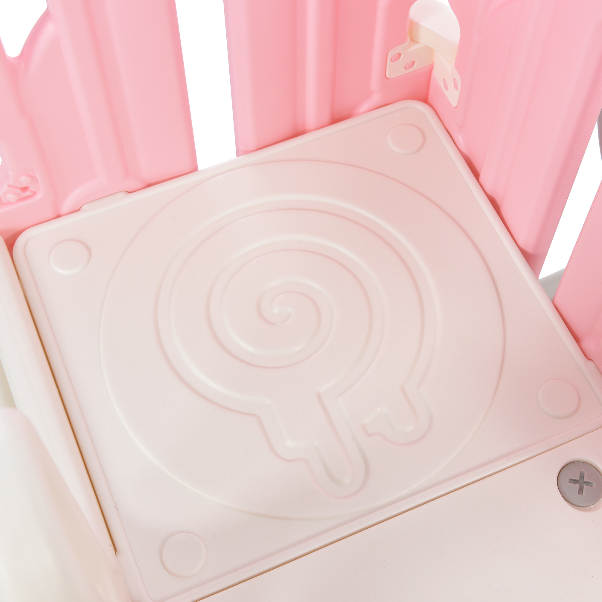 [Children's Playground 5-in1] Refreshing styling design! Delicate and cute freestanding swing and slide set for toddlers with three functional parts: 1 slide, 1 climbing ramp, 1 swing, 1 basketball hoop, and 1 hidden space for toy storage. This set allows children to completely release their playful nature, and they can play with their friends for hours!